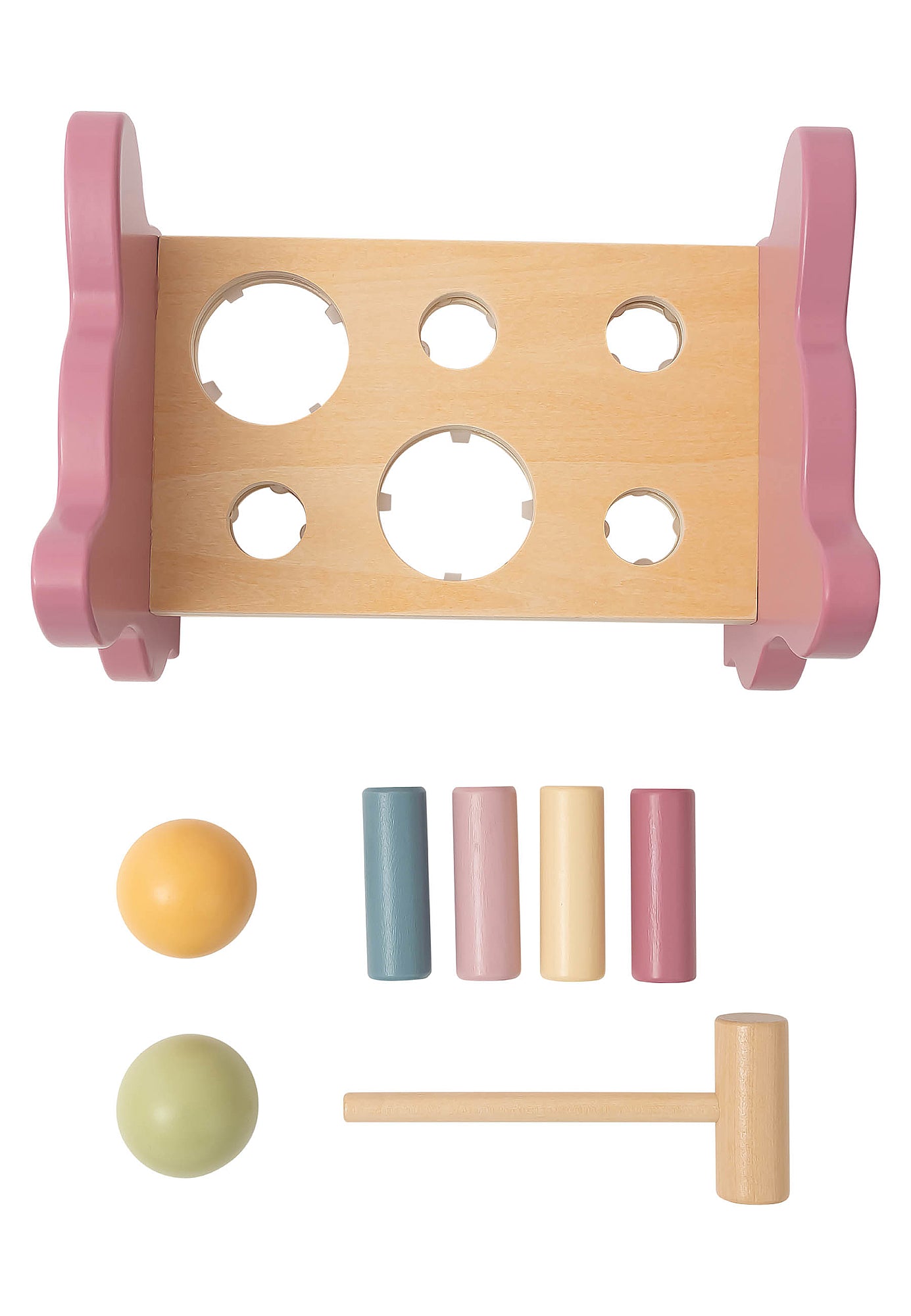 Arendav puidust motoorikamänguasi, mis sobib lastele alates 12. elukuust. See mänguasi aitab treenida käe-silma koordinatsiooni, keskendumisvõimet ja osavust, pakkudes samal ajal rõõmu ja loovust. Komplekt: värvilised pallid, puidust haamer ja looma motiiv