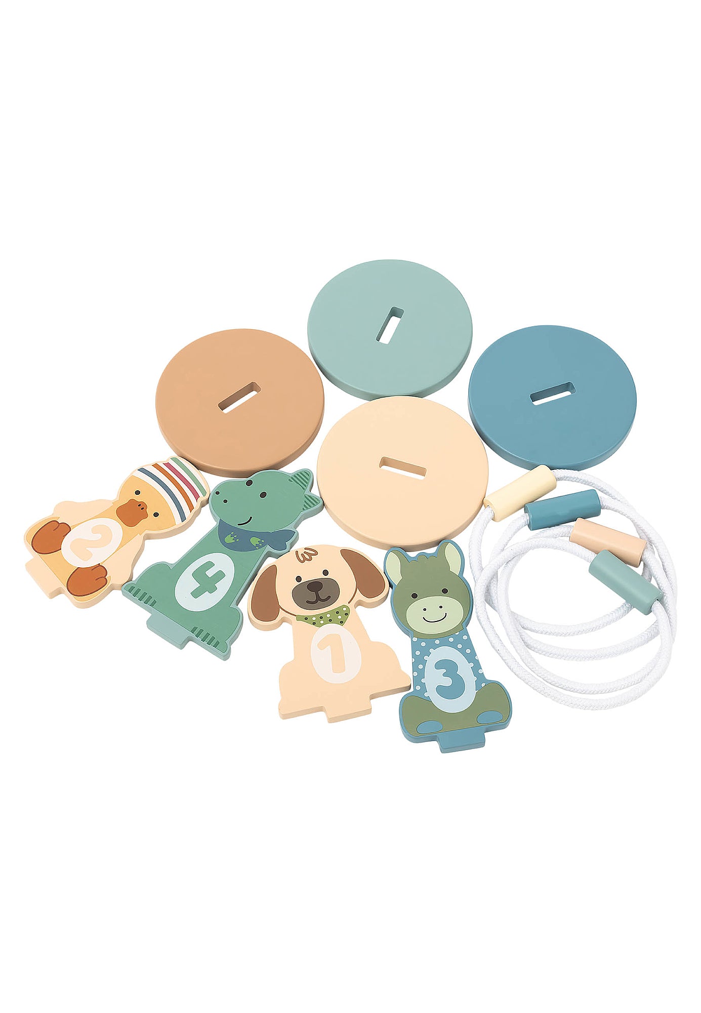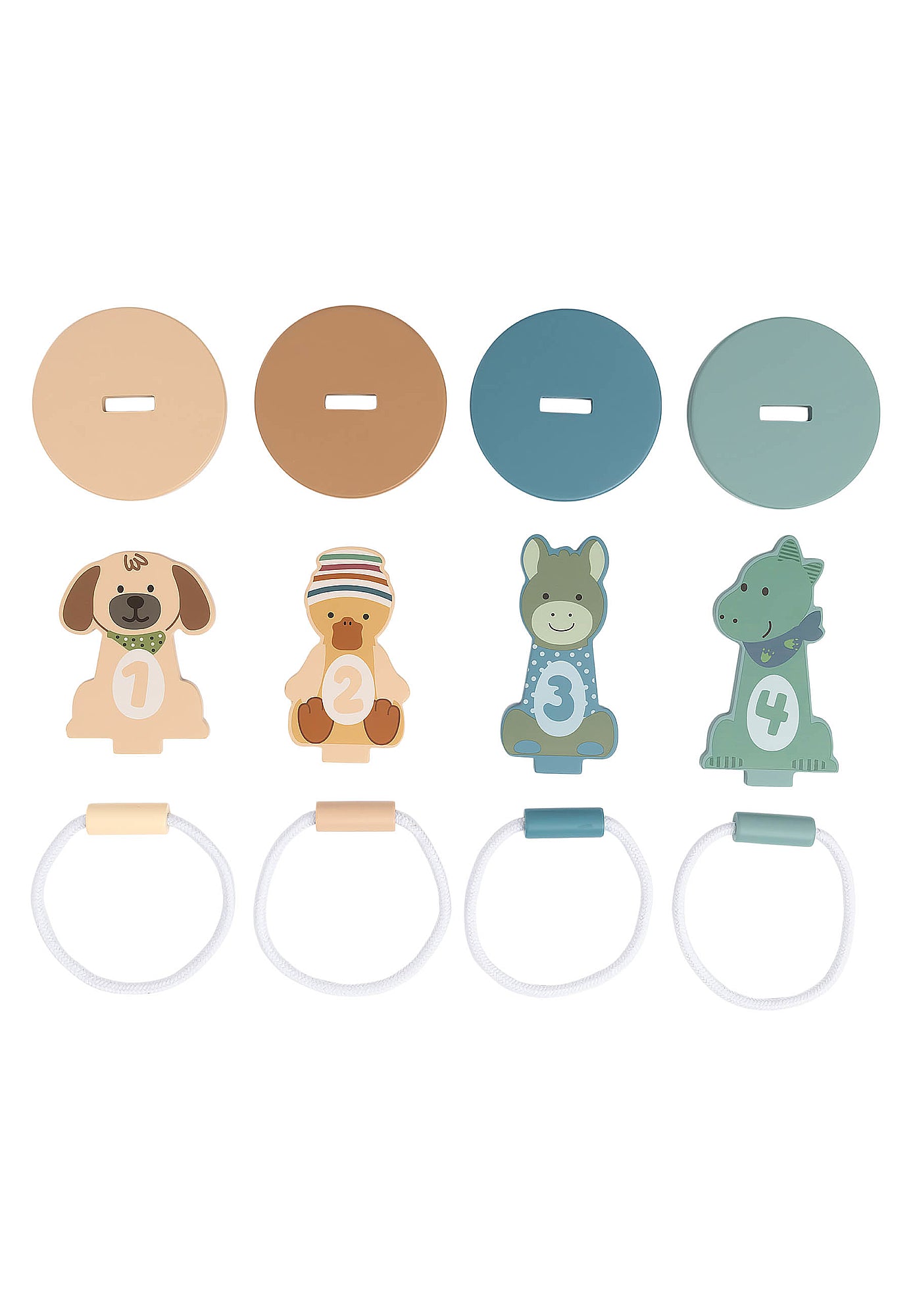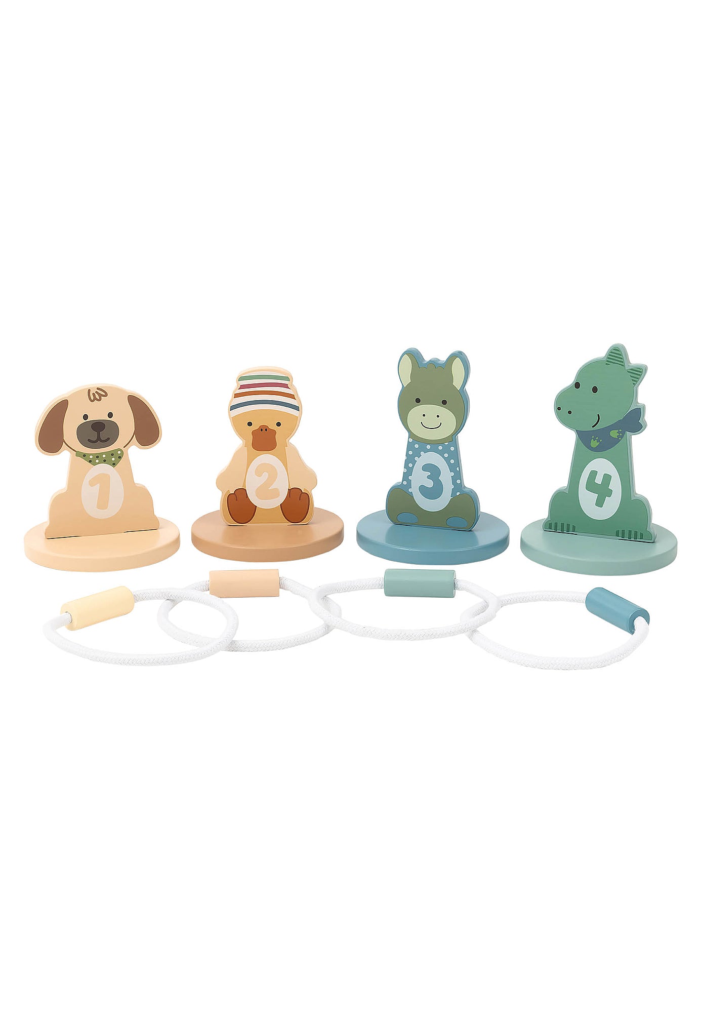 Arendav ja lõbus puidust viskemäng, mis sobib lastele alates 36. elukuust. See mänguasi pakub mängulisi väljakutseid, aidates arendada motoorikat, keskendumist ja numbritest arusaamist. Komplektis 4 puidust loomakujukest (koer Lucky, eesel Emmi, part Edda ja dinosaurus Rexi) + sobivad viskerõngad
